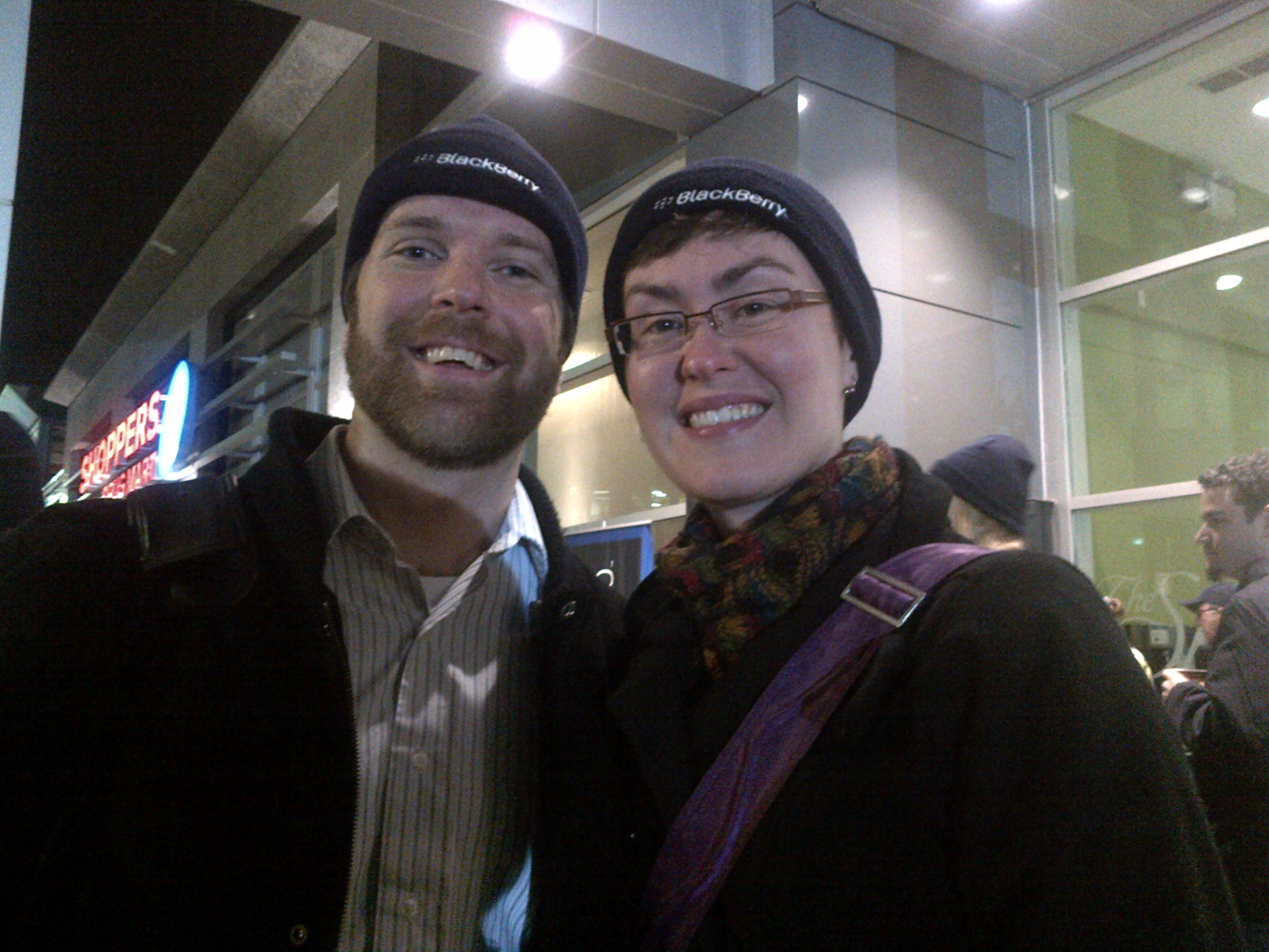 My wife, Kate Daley, and I in our new BlackBerry toques